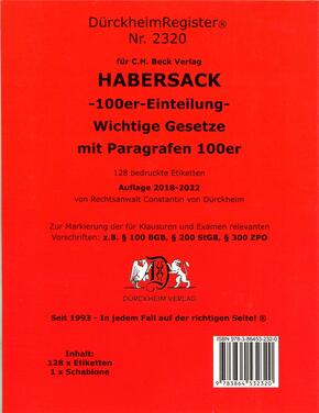 128 Registeretiketten (sog. Griffregister) für den HABERSACK, C.H. Beck Verlag - Mit den wichtigsten Gesetzen - 100er-Unterteilung des BGB, StGB, StPO und ZPO und ABC - Zur Befestigung an FOLIEN, Trennblättern oder Buchseiten- DürckheimRegister® sind seit 1993 der Standard in den Gesetzessammlungen vom C.H. Beck Verlag und dtv- In jedem Fall auf der richtigen Seite®128 bedruckte, selbstklebende Griffregister mit 100er-Unterteilung des BGB, StGB, StPO und ZPO und ABC zur Befestigung an FOLIEN, Trennblättern oder Buchseiten. Bewährte Auswahl bedruckter Griffregister zur Befestigung an Trennblättern oder Buchseiten. Über das DürckheimRegister® werden die gesuchten Gesetze in den großen Gesetzessammlungen markiert und zielsicher aufgeschlagen. Es kennzeichnet die häufigsten der für Studium und Praxis relevanten Gesetze. Mit den sich bereits über tausendfach bewährten DürckheimRegister® erhalten Sie nicht nur in den Klausuren einen brauchbaren Überblick über alle Gesetze der Sammlung H ABERSACK.