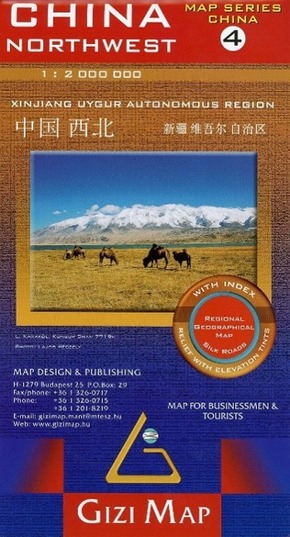 Gizi Map China Northwest - Xinjiang Uygur Autonomous Region. Map for Businessmen & Tourists. Silk Roads. With Index. Relief with elevation tints. Silk Roads. With Index. Relief with elevation tints