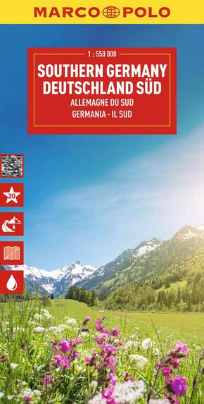 Hauptkarte 1:550 000, beidseitig bedruckt, Übersichtskarte, Index: mehrsprachige Legende (D, GB, F, NL, I, E, CZ, PL), 20 MARCO POLO Highlights, Verkehrs- und Reiseinformationen, digitales Ortsregister mit Postleitzahl, Bundesland, Gemeindezugehörigkeit und Suchfeldangabe, Blattübersicht.